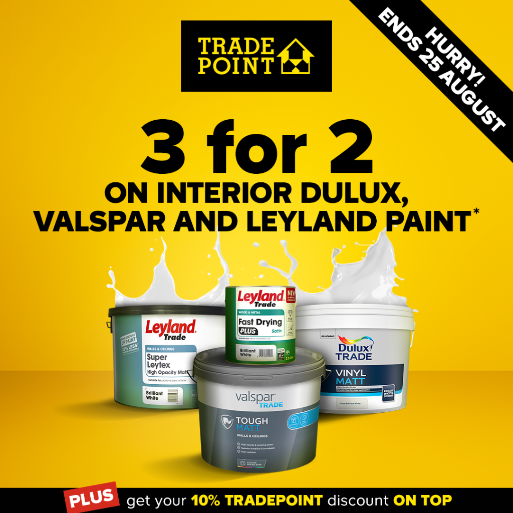 Head over to the TradePoint website now to shop unmissable deals like 3 for 2 on Leyland Trade, Dulux Trade and Valspar Trade interior paints. Offer ends 25 August.